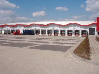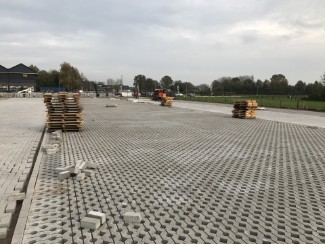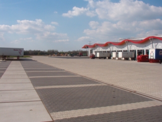 | |  | Parkeerplaatsen voor vrachtwagen gemaakt van H klinkers en stelcon platen. | | In en uitritten van een distributiecentrum gemaakt van BKK klinkers. |