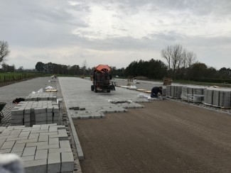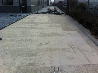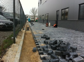 | |  | Het maken van een afvoergoot voor regenwater bij een bedrijfspand. | | Het egaliseren is gedaan met een laserblad en hier wordt machinaal gestraat met H klinkers. |