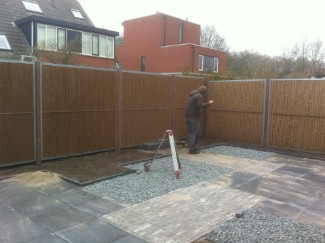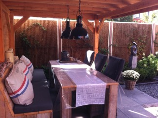| Een verhoogd terras in de tuin. | | Veranda gemaakt van Douglas hout en cocos schutting. |