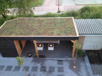 |  | |  | Woodvision schuttingdelen. | | Overkapping met sedum dak. |