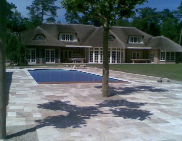 | Van tuinontwerp met sierbestrating en zwembad tot .... | | ..... de realisatie uw rustieke droomtuin met Ceramic terras. |